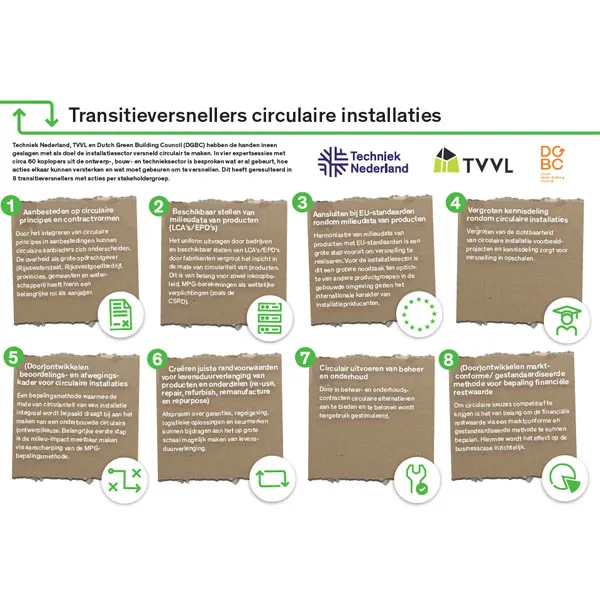 "Passie zorgt dat je op tijd bent, urgentie maakt je te laat." De circulaire economie biedt de installatiesector en elektrotechnische detailhandel unieke kansen om bij te dragen aan herbruikbaarheid van grondstoffen. Techniek Nederland neemt hierin een actieve rol door kennis te ontwikkelen, kansen te benutten en leden te inspireren. Dit creëert meerwaarde voor installatiebedrijven, klanten en het klimaat. Op deze pagina vind je links en documenten die deze rol verder toelichten.